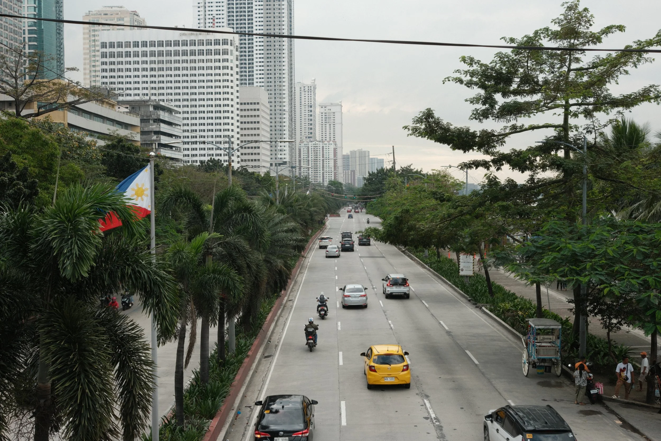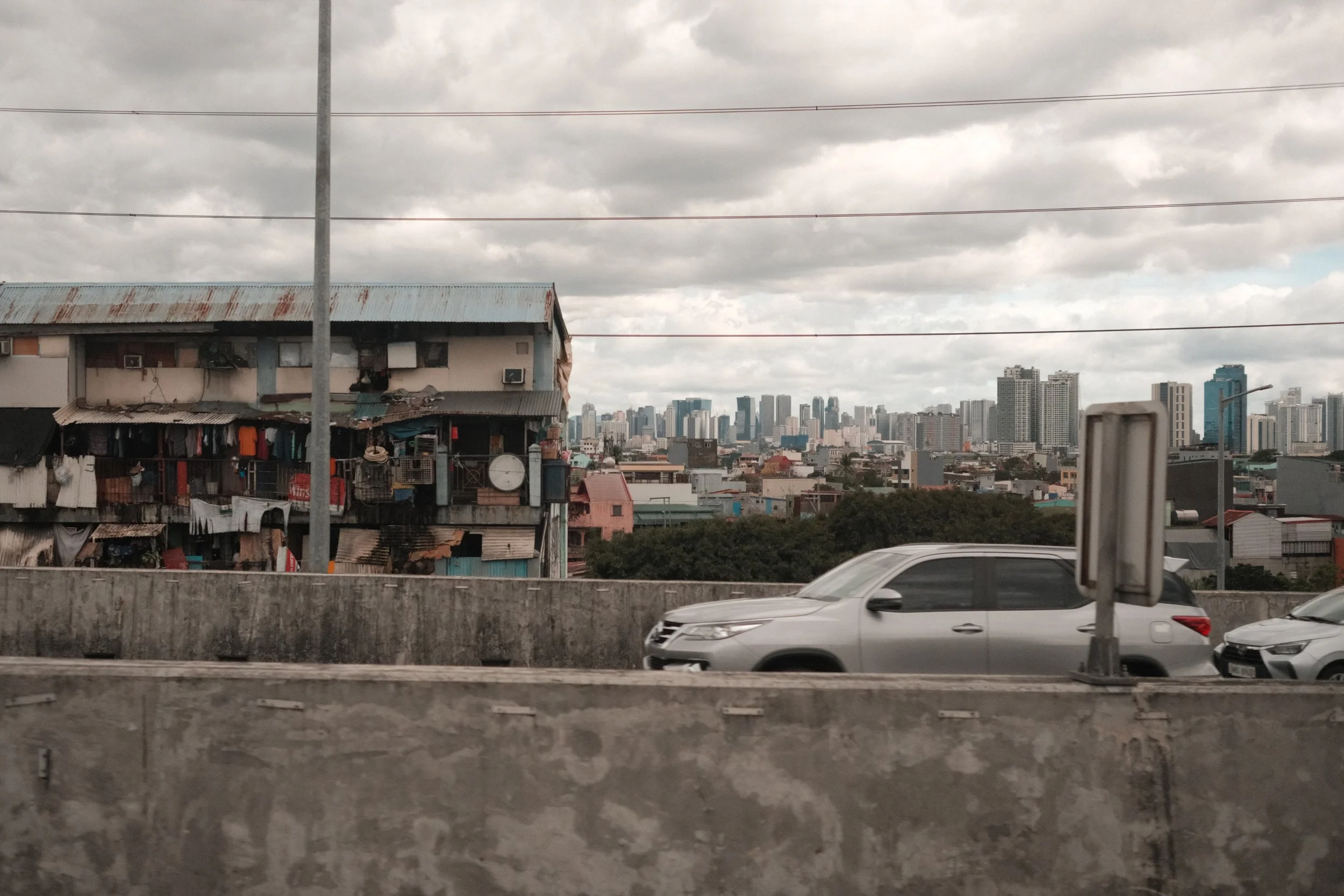 Store kontraster i Manila, trangbodd fattigdom langs motorveien med skyskrapere i bakgrunnen.